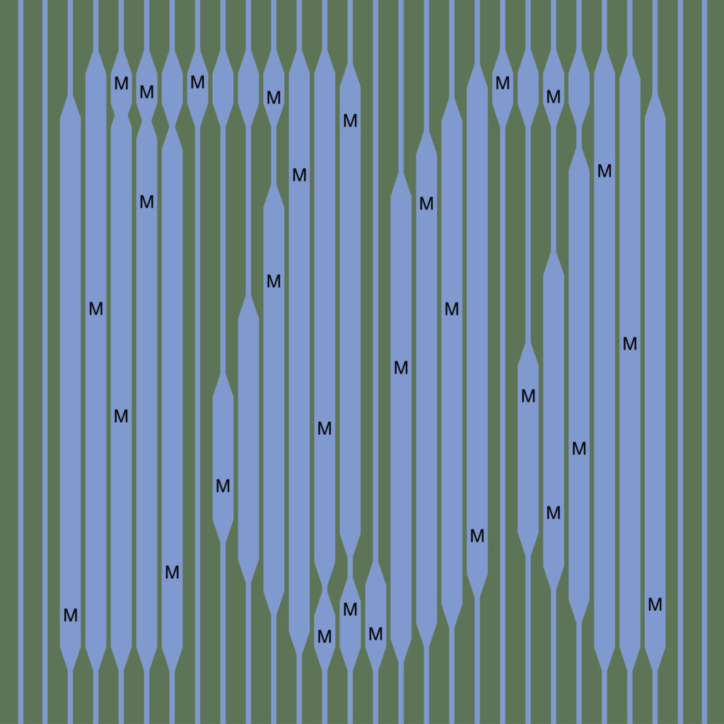 „Az M betű formáját újragondolva egy váltakozó vonalvastagságú struktúrát hoztam létre, majd kisebb méretű „M” betűk elhelyezésével tettem dinamikussá és játékossá a kompozíciót.”