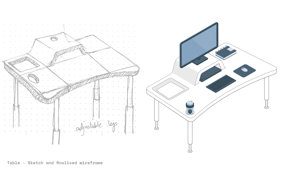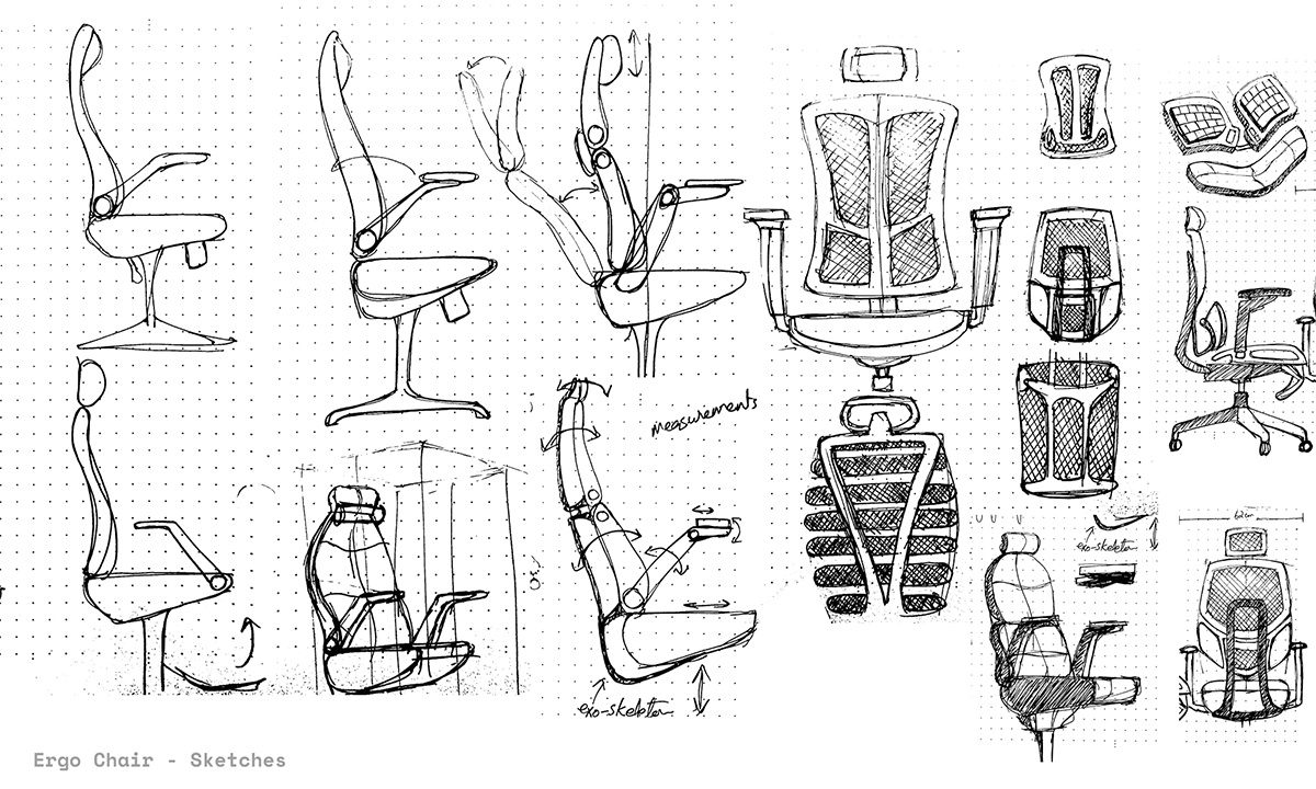 Kutatása során Bashir két, a számítógépes munkavégzésnél kulcsfontosságú termékpárt azonosított: egér-billentyűzet és szék-íróasztal párosát. A tervezés előkészítő szakaszában egy szék és íróasztal kifejlesztése mellett döntött, felismerve hogy az sokkal nagyobb hatással lehet a felhasználói kényelemre mint az egér-billentyűzet. A szék tervezésekor Bashir saját irodai és remote munkatapasztalatára alapozott, de számos online értékelést és összehasonlítást is megvizsgált. A tanulságok végül a szék különböző elemeiben testesültek meg, így lett része a koncepciónak a fejtámla, ami sok irodai székből bántóan hiányzik, a háttámla hálós anyaga a túlzott hőtartás elkerülése érdekében került a koncepcióba, de a kartámaszok is átgondolt tervezői döntések végén nyerték el végső formájukat – a hátrészhez kapcsolónak, így több hely marad a lábaknak.